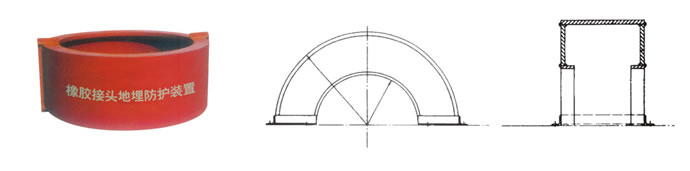 此地埋裝置為兩個半圓形中空組合而成.將橡膠頭和管道平焊法蘭全部裝入體內,兩端設有兩半圓形小平面帶鋼騎于兩惻法蘭外管壁.兩端立面支撐根據土層深度而定.足以承受外壓負重。該裝置配有一定數量對臺鎖緊螺栓, 以備安裝完畢后裝配。其安裝方法為:安裝橡膠接頭—>保護裝置內涂防銹柒—>安裝下部1/2保護裝置放上上部1.2保護裝置—>旋緊對合鎖緊螺栓(注意安裝時要使橡膠接頭確保處于裝置中心位置)—>保護裝置外涂防銹柒回填原土.下部搗實,上部夯實—>三合土和墊層—>鋪設地面(好在適當位置設有永久性標志.以備以后檢查更換時確定位置)。