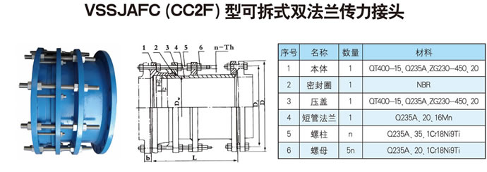 可拆式雙法蘭傳力接頭:安裝在管道上后.根據(jù)所需的伸縮距離進行限位+擰緊螺母.彈性密封圈在螺母壓蓋的作用下依靠相互斜度. 緊壓在管子外圈起密封和連接作用.主要和管道閥門連接不但起到管道補償作用.更方便了閥門的維修及更換。